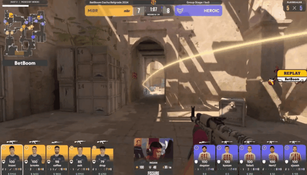比赛来到第16回合,MIBR连续的溃败导致他们的经济一塌糊涂,没有任何的办法只能选择eco,而这一分MIBR想要破局只能通过强势前压找机会,才能翻盘。开局Heroic的默认并没有对中路进行过多的压制,这就导致静音一路前压的insani轻松摸到了匪口里,好在随后的拍拍熊从A厅返回一枪将其带走。没有经济的MIBR正面的防线极其脆弱,Heroic的提速很快就将MIBR在A区的正面防线全部击溃,迅速占领包点,MIBR剩下几人只能选择保枪。