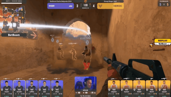 下半场攻防转换, 来到进攻方的Heroic不再给MIBR挣扎的机会,手枪局拿下之后连续得分,11分直逼赛点。