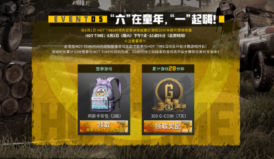 任务五【“六”在童年,“一”起嗨】,则将于6月1日(周六)下午7点至10点59分举行,在活动首日“六”在童年,“一”起嗨!登录就能获得鸡斯卡背包(2级),游戏时长累计20分钟,还可获得300 G-COIN(7天)。