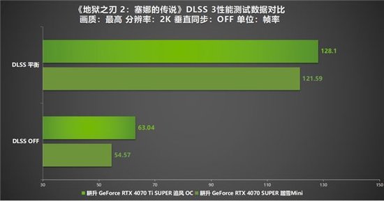 接下来是2K分辨率的测试。在关闭DLSS 3技术的情况下,耕升 GeForce RTX 4070 SUPER 踏雪Mini的平均帧率为54.57帧,这意味着在游戏过程中可能会遇到轻微的卡顿现象。然而,一旦激活DLSS 3技术,显卡的性能均实现了飞跃性的增长:耕升 GeForce RTX 4070 SUPER 踏雪Mini的平均帧率增加了220%,来到平均121.59帧;而耕升 GeForce RTX 4070 Ti SUPER 追风 OC的平均帧率增长了203%,来到平均128.1帧。可以看见,DLSS 3技术的应用显著提升了游戏体验的流畅度。