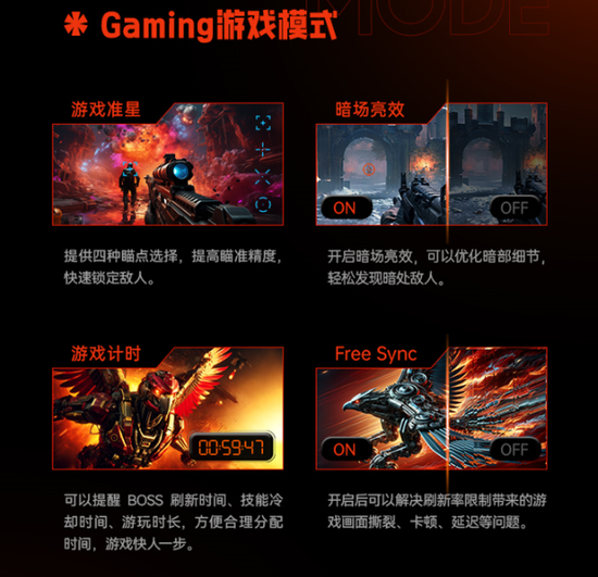 值得一提的是,HKC 猎鹰二代 G25H1 和 G27H1 显示器的 OSD 菜单中的可设置内容非常丰富, 从基础的色彩、亮度、对比度设置,到 FreeSync 、MPRT 技术这种进阶选项一应俱全,同时内 置丰富游戏模式和情景模式,如职业游戏情境预设、暗场亮效、游戏准星、计时器等功能,玩 家可以使用五向摇杆按键轻松调节,一键切换,带来更流畅顺心的游戏体验。