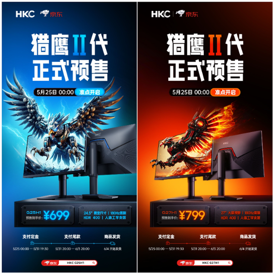 日前,HKC 猎鹰二代 G25H1 和 G27H1 显示器已于今日(5 月 25 号)正式上市,开启预售。