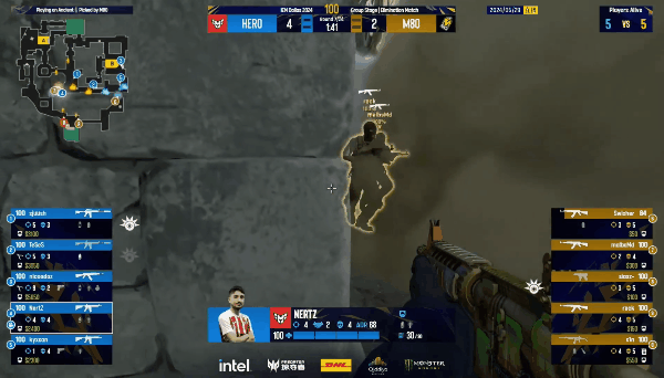 比赛来到第18回合,开局Heroic选择常规默认,双方在第一波道具交互之后Heroic占领了黑屋,准备和大坡同步直接爆弹推进包点。感受到Heroic带来的进攻压力,M80当机立断直接反推B坡,而这也让正在落位准备进攻的Heroic搓手不及,B坡被M80打出了一个1换3硬生生将Heroic这一分的战术布置全部打乱,而更加尴尬的是此时雷包还在匪家,最终Nertz面对1v2的残局毫无操作空间。M80收下了这一分。