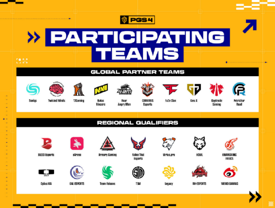 通过各个区域性赛事的选拔,共计24支战队成功晋级本次PGS3,所有战队会被分成A、B、C三个小组内,并通过3天的循环赛,角出前16名晋级总决赛。以下是进入总决赛的16支战队名单:TWIS战队、CES战队、NH战队、Soniqs战队、TSM战队、EA战队、VLTH战队、GNL战队、KDF战队、PeR战队、HOWL战队、KRG战队、FaZe战队、17Gaming战队、NAVI战队、WBG战队。