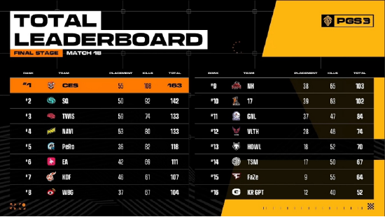 回过头来看,作为PGS3的总冠军,CES战队的实力自然是毋庸置疑的,全队的爆发力非常足,而且刚枪势头也猛,特别是MVP选手Himass的数据表现,和其他人堪称断层式碾压。看得出来,在前两日的比赛中,CES似乎还有点收敛,到了最后一日,直接豪夺73分完成逆转,将在前两天排名靠前的TWIS和SQ直接拉下王座。