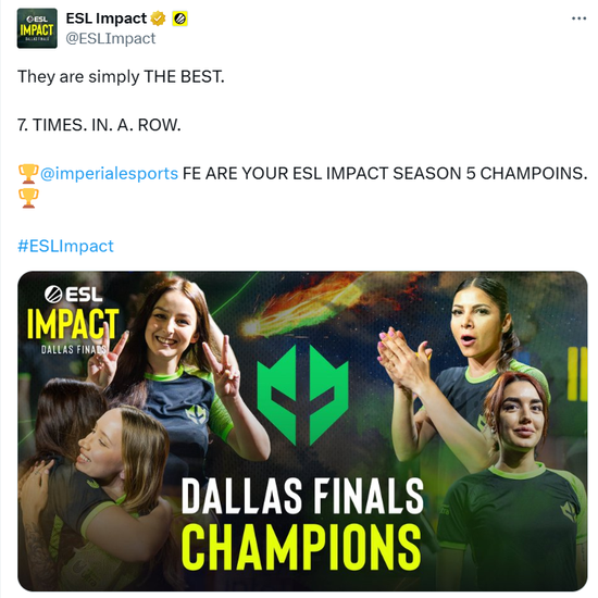 ESL Impact赛事官方也发布动态,庆祝Imperial fe获得这次冠军。