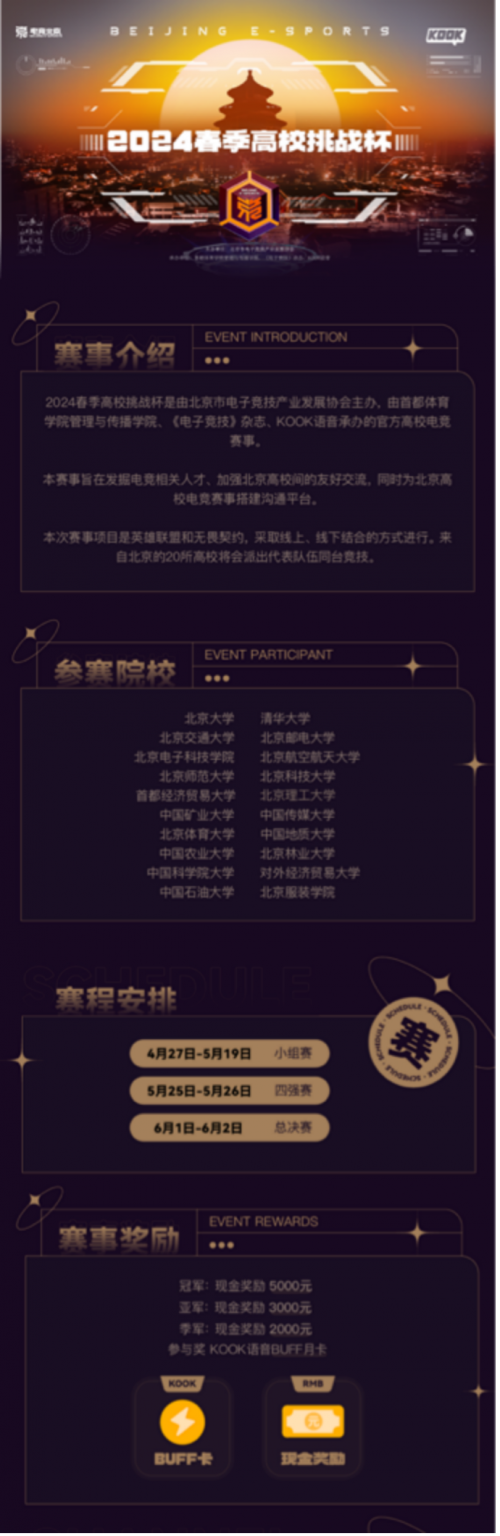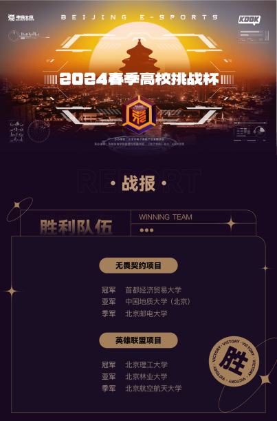 6月2日,由北京市电子竞技产业发展协会主办,首都体育学院管理与传播学院、《电子竞技》杂志、KOOK语音承办的“2024春季高校挑战杯”圆满结束。首都经济贸易大学与北京理工大学分别夺得无畏契约项目及英雄联盟项目的冠军。此次赛事,共吸引了来自北京地区二十所高校的三十余支代表队,参与英雄联盟和无畏契约两个项目的比赛。