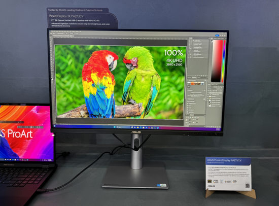 本届台北电脑展上另一款华硕专业显示器ProArt PA27JCV也相当引人注目。它采用27英寸5K(5120 x 2880)分辨率和218高PPI显示屏设计,具有极为震撼的清晰度与细腻感。覆盖了99%DCI-P3和100%sRGB广色域,精准呈现真实的色彩画面。并且出厂预校准,通过Calman认证,可提供ΔE<2的色彩精准度与细致精确的色彩分级。它也支持LuxPixel™技术,包含防眩光和低反射涂层,可产生类似纸张的屏幕效果。与可以软化图像的传统哑光表现不同,它的像素色彩保真度和清晰的细节都极为卓越,是完成创意,实现创作梦想的不二利器!