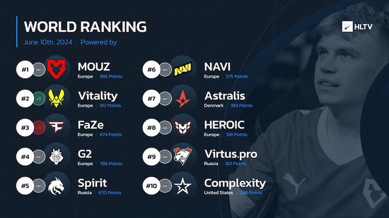 1-10名中Vitality取代FaZe升至第二名,其他队伍排名无变动。