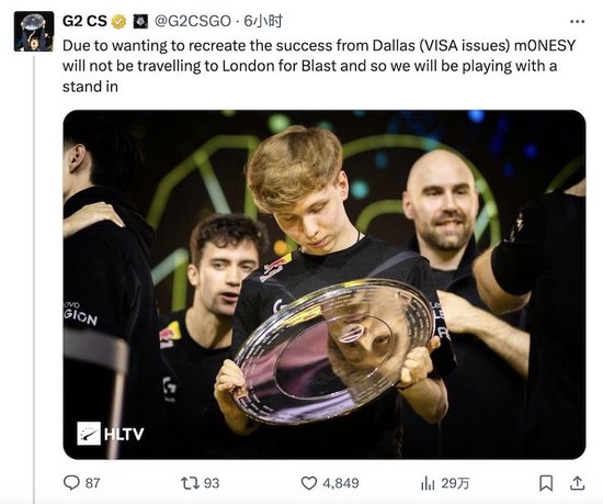 今天G2宣布m0NESY因签证问题而无法随队参加BLAST 春季决赛,教练TaZ将替补上场。