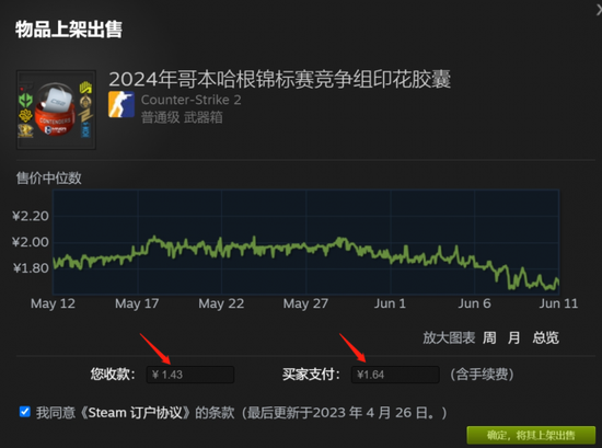 按照该胶囊在Steam市场的起价1.64元出售,到手Steam余额1.43元(出售188件到手Steam余额268.84元)。如果选择其他饰品可以通过饰品24小时的销量来判断该饰品是否热门,然后在IGXE购买时建议选择Steam市场热门饰品,减少等待饰品出售的时间。