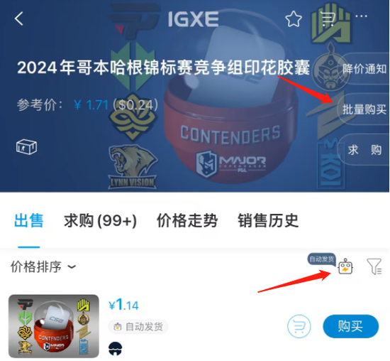 以图中胶囊为例,买入价1.14元(批量购买188件花费214.32元)。建议选择自动发货饰品,10秒入库,减少等待饰品到库的时间。
