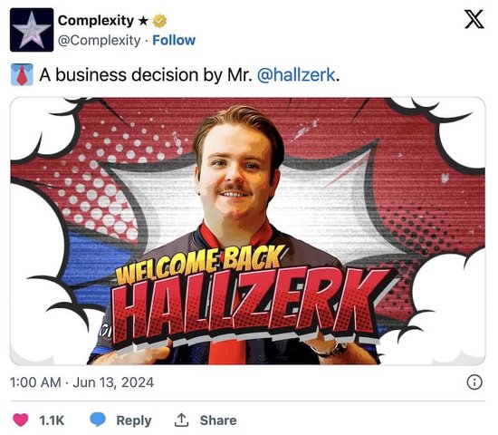 今天Complexity战队宣布同hallzerk签订新合约。在队伍参加ECL 延雪平站的前几天,双方达成一致。