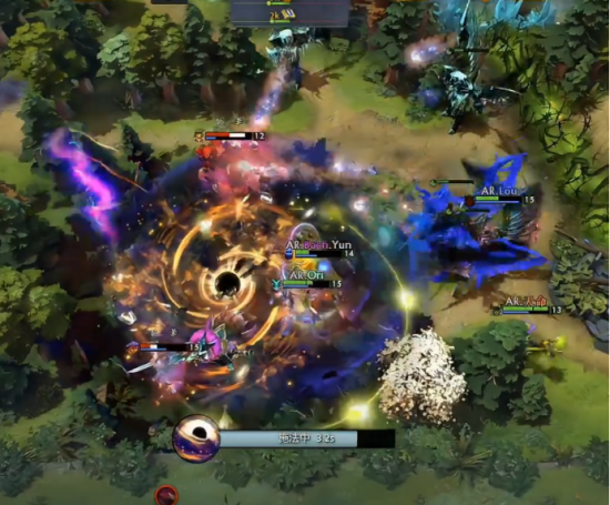 18分钟轮到AR开雾进攻,人马先手先杀一发条,小骷髅跟獸动手虚空却被虚空跳出反手大招打了个完美团,TZ瞬间阵亡四人经济差开始拉开,AR马上打盾。