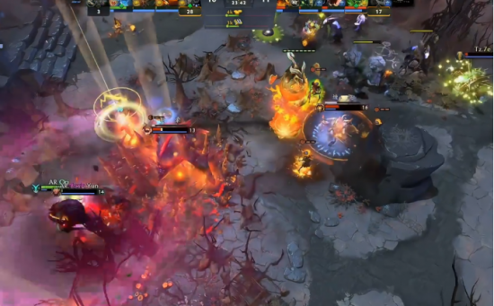 好在电魂大树抓住了机会抓到残血TB将其不朽盾打掉,拖延了一些局势。但正面仍然是AR强势。33分钟AR集合打盾,TZ姗姗来迟只得放盾。但AR也推不上去,TB在小黑面前像纸一样。37分钟AR成功找到机会抓到电魂,但TB也被打残,小黑赶到战场开启BKB冰山两箭点死TB,谜团大招刚抬手就被大树断掉,TZ团灭AR,局势瞬间反转。