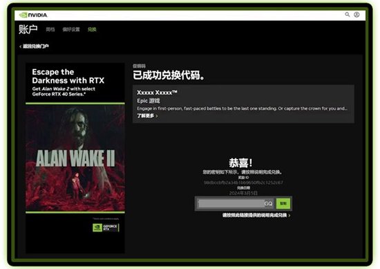 完成兑换流程后,可在NVIDIA兑换网站中,NVIDIA APP中,以及您的账户关联电子邮箱中查收激活。获取激活码后,请下载安装WeGame客户端(//www.wegame.com.cn)并点击可查看兑换码对应的游戏产品,已经绑定到账户中,按页面步骤点击“兑换”后可获得兑换码及确认邮件。