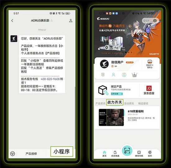 第二步:关注“AORUS俱乐部”微信公众号,点击小程序并绑定购买的产品,同时点击“战力齐天”活动专栏,按流程填写相关信息(个人手机号、显卡型号、购买店铺和订单编号等)并上传购买相关订单截图或发票等凭证,随后待技嘉工作人员审核,大约15个工作日内将通过预留的手机号发放兑换码。