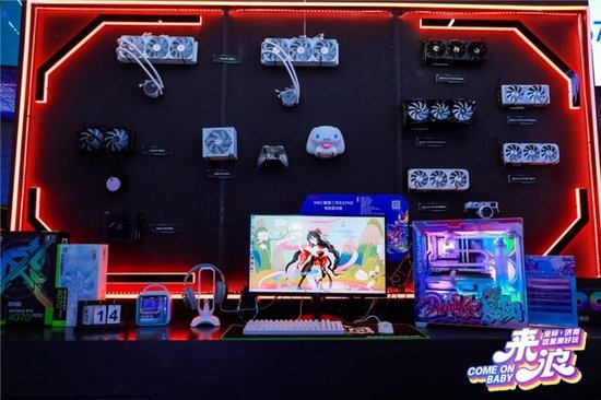 在嘉年华中,耕升品牌凭借其高质量和创新产品,一如既往地成为了焦点,吸引了众多观众的目光。耕升展出了最新款的GeForce RTX 40系列显卡和机电等硬件产品,不仅展示了产品的强大性能,还凸显了卓越的设计理念。耕升展区被划分为两个部分,其中一部分是采用黑色洞洞板设计的立体展示区,这里陈列着耕升的高端硬件产品,包括显卡、水冷等设备。墙体四周所散发的红色光芒,在夜晚映射在这些产品上后,更为其增添了些许科幻效果,为参观者提供了一场视觉享受。现场观众对这些令人印象深刻的产品赞不绝口,纷纷给出好评。