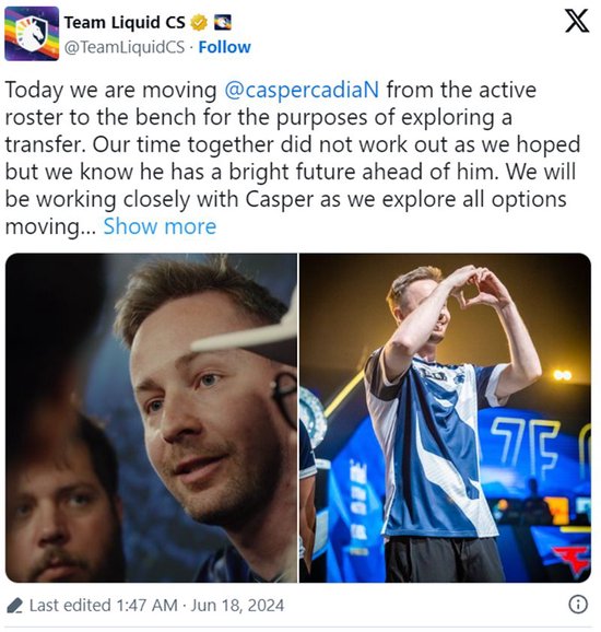 cadiaN已经被Liquid下放,从首发阵容中除名,以“探索转会事宜”。