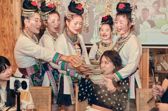 除了与当地班超队进行足球比赛外,节目组还安排了多种多样的生活体验和游戏互动环节,让主播可以深入感受、体验贵州侗族的民俗文化魅力。主播团如牙牙学语的孩童一般,学习用侗族语言朗诵诗歌;感受了当地喜迎贵客的最高标准——侗寨拦门酒文化的热情;也体验了宴席的最高形式与隆重礼仪——长桌宴以及高山流水的劝酒文化。