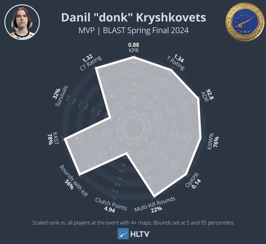 他是一名极具爆发力的突破选手,这意味着他的巅峰表现总是和胜利密切相关。他的上一个EVP是在Major赛场上单枪匹马击败Cloud9后获得的,而在BLAST 春决1/4决赛中,他又在对阵FaZe的决胜图Mirage上以27-11的战绩、142.4的ADR和2.28的rating重现了这一壮举。