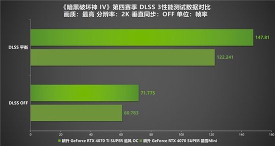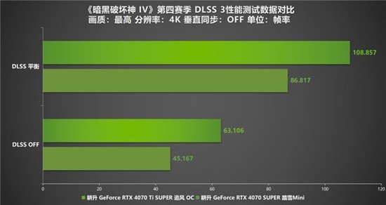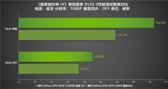 在1080P分辨率下对《暗黑破坏神 IV》第四赛季进行的测试显示,游戏优化得非常好。即使不使用DLSS技术,两款测试显卡都能轻松实现平均100帧以上的表现,保证了极佳的游戏流畅度。当开启DLSS 3技术后,游戏帧率有了显著的提高。在DLSS 3的平衡模式下,RTX 4070 SUPER 踏雪Mini的平均帧率达到了148.346帧,而RTX 4070 Ti SUPER 追风 OC的平均帧率更是超过了190帧。与未开启DLSS 3技术时相比,性能提升了143%和162%。这样的性能提升,让玩家在享受高质量画面的同时,也能体验到流畅无卡顿的游戏过程。