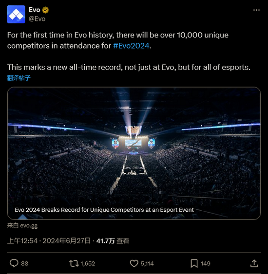 一年一度的格斗游戏界盛事,格斗游戏大赛 EVO 2024 已于本周早些时候截止报名。日前赛事组织者宣布,今年定于拉斯维加斯举办的 EVO 不仅将是赛事史上规模最大,而且也将是整个电竞领域有史以来举办的规模最大的锦标赛。