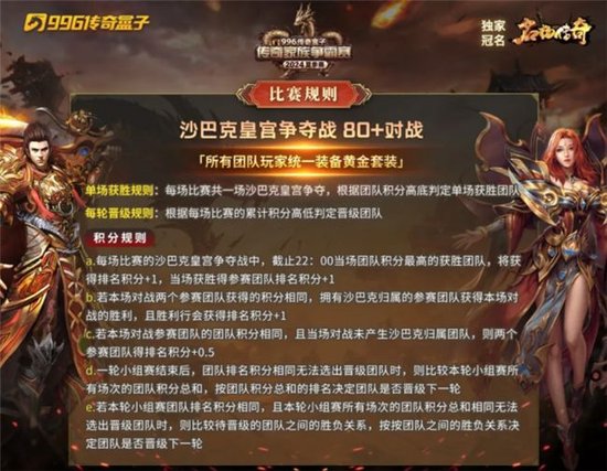值得一提的是,这一届的996传奇家族争霸赛夏季赛在赛制上做了调整,与往届争夺光圈的规则不同,选择了经典沙巴克皇宫争夺玩法,每天的比赛从20:00到22:00,仅用一场皇宫争夺定胜负,根据团队积分高低判定单场获胜团队,并根据每场比赛的累计积分高低判定晋级团队。