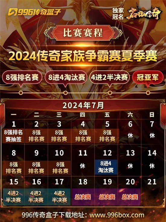 这个夏天注定要与激燃同行,在奥运会还有不到一个月的节点上,所有的传奇玩家将要先迎来另一场让他们期待已久的电竞赛事。自从996传奇家族争霸赛春季赛圆满结束后,夏季赛也紧锣密鼓地登上了日程,这一届996传奇家族争霸赛·夏季赛由“名扬传奇”独家冠名,夏季赛将在7月2日正式开启,持续到7月20日,为大家带来长达19天的精彩对决。