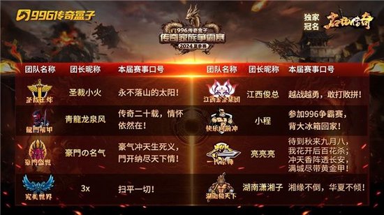 这8支团队分别是圣裁王炸、龙门飞甲、豪门盛世、完美世界、江西金圣集团、快乐向前冲、一代宗师、湖南和天下,它们有的是家族精英自成一团,也有的是强强联手精锐合团,其中大部分成员都有过996传奇家族争霸赛的参赛经验,8名团长更是身经百战,知己知彼,无论遇上哪一支对手团队,都足以在斗智斗勇中碰撞出激烈的火花。