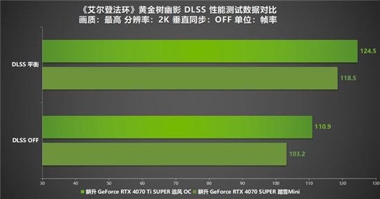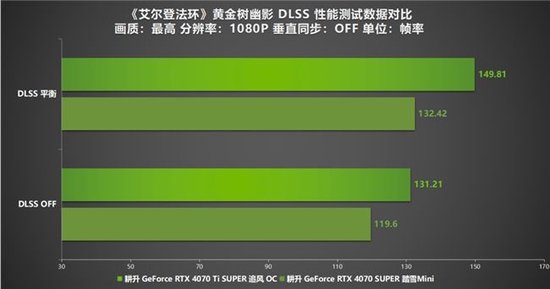 在1080P分辨率下对《艾尔登法环》DLC“黄金树幽影”进行的测试结果表明,游戏的优化非常出色。即使不启用DLSS技术,两款测试的耕升 GeForce RTX 40系列显卡——RTX 4070 SUPER 踏雪Mini和RTX 4070 Ti SUPER 追风 OC——都能轻松达到平均100帧以上的成绩,确保了极佳的游戏流畅性。当开启DLSS技术后,游戏的帧率有了显著的提升。在DLSS的平衡模式下,RTX 4070 SUPER 踏雪Mini的平均帧率提升到了132.42帧,而RTX 4070 Ti SUPER 追风 OC的平均帧率更是达到了149.81帧。与未开启DLSS时相比,性能分别提升了114%和110%。这样的性能增益让玩家在享受高画质的同时,也能感受到流畅无阻的游戏体验。