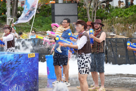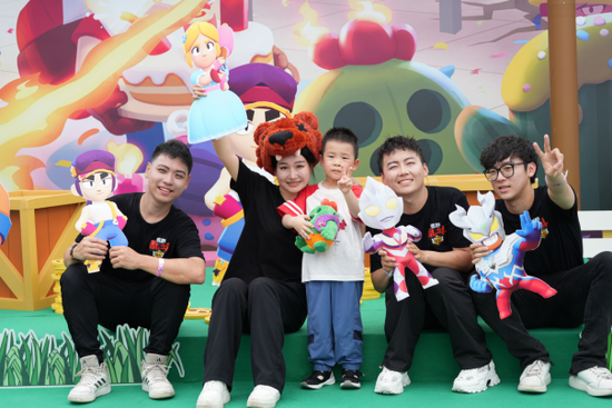 在海昌公园的会场也充分展现了来自于快乐聚会的魅力:孩子们被可爱的柯尔特、尼塔和奥特曼的玩偶吸引,家长们则和他们一起玩起了水枪。