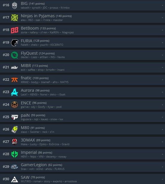21-30名中守门员是SAW战队,一共有8支队伍的积分不足100分。