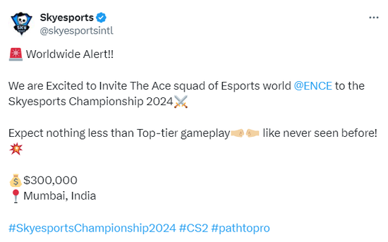 我们很高兴邀请到世界顶尖战队ENCE参加2024年Skyesports锦标赛,期待这场前所未有的顶级赛事吧!