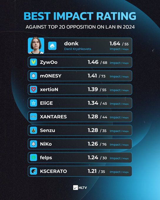 今天外媒统计了今年上半年线下赛对阵Top20战队时选手Impact rating的Top10榜单。从数据看,Danil Kryshkovets | donk再度位列第一。他在55张地图上有着1.64的Impact rating。紧随其后的是Mathieu Herbaut | ZywOo,68张地图1.46 Impact rating。第三名则是Ilya Osipov | m0NESY,75张地图1.41 Impact rating。