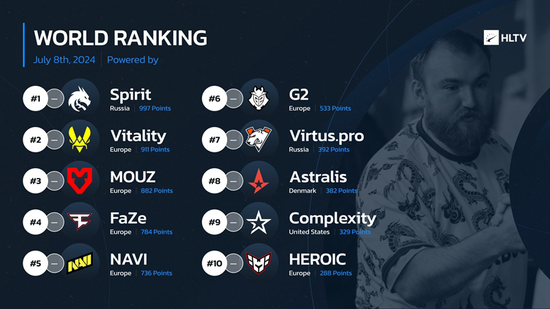 今天HLTV公布了最新一期世界排名。鉴于休赛期仍在进行当中,榜单基本上没有什么大变动。尤其是1-15名毫无变化。Spirit战队依旧稳居世界第一的宝座,以997的积分超越第二名Vitality共86分。