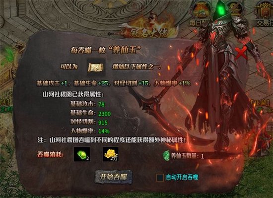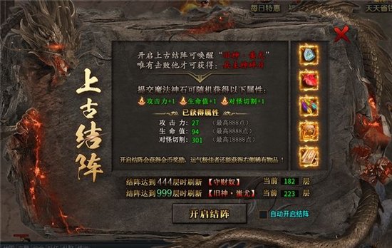像是上古结阵可以通过提交魔法神石来随机获得攻击、生命、对怪切割等人物属性提升,当结阵达到一定层数还可以召唤出boss蚩尤,获取到专属神器;类似的还有山河社稷图功能,也是可以通过提交材料随机获得攻击、基础生命、人物爆率等属性的提升,虽然这些功能系统里每次提交材料得到的单次加成数值都很小,但通过累计叠加慢慢养成,就能稳定成长。