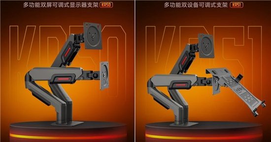 HKC作为专业的显示器与相关硬件的方案提供商,自然在显示器支架臂方面也是早有动作,针对双屏联动的需求,HKC推出了KR50双显示器支架臂和KR51显示器+笔记本支架臂。