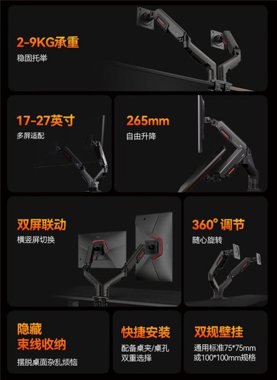 支架臂采用双臂结构,每个臂均支持通用标准75*75mm和100*100mm的壁挂规格,能独立支撑一台17-27英寸的显示器,最大承重达9kg,确保了显示器能稳固挂载。