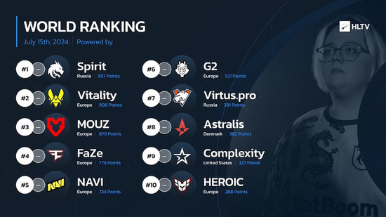 前十名当中没有任何变动。Spirit依旧稳居世界第一的宝座,不过前十名中的部分战队会参加EWC电竞世界杯。比如G2战队。