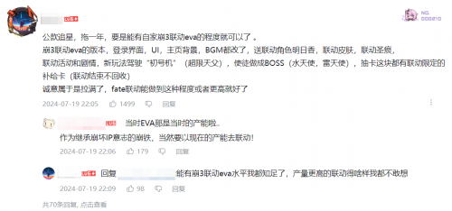 而另一大重点,便是与FateUBW的联动了。尽管离联动的上线还有一年的时间,《星铁》这次联动的也只是Fate系列的其中一部作品,但已经有不少玩家开始畅想这次的联动究竟会以怎样的形式呈现。除了联动角色或者限定外观外,甚至有人搬出了《崩坏三》与EVA的联动的内容,希望《星铁》也能为FateUBW专门开一个联动版本……