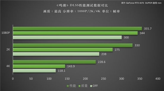 在2K分辨率下对《鸣潮》进行的测试结果表明,游戏的优化非常出色。即使不启用DLSS 2技术,两款测试的耕升 GeForce RTX 40系列显卡——耕升 GeForce RTX 4070 SUPER 踏雪Mini和耕升 GeForce RTX 4070 Ti SUPER 追风 OC——开启DLSS 2后都能轻松达到平均230帧以上的成绩,确保了极佳的游戏流畅性。当开启DLSS 2技术后,游戏的帧率有了显著的提升。在DLSS 2的质量模式下,耕升 GeForce RTX 4070 SUPER 踏雪Mini的平均帧率提升到了275帧,而耕升 GeForce RTX 4070 Ti SUPER 追风 OC的平均帧率达到了惊人的301.9帧。这样的性能增益让玩家在享受高画质的同时,也能感受到流畅无阻的游戏体验。而在开启性能模式后均可以达到330帧以上。