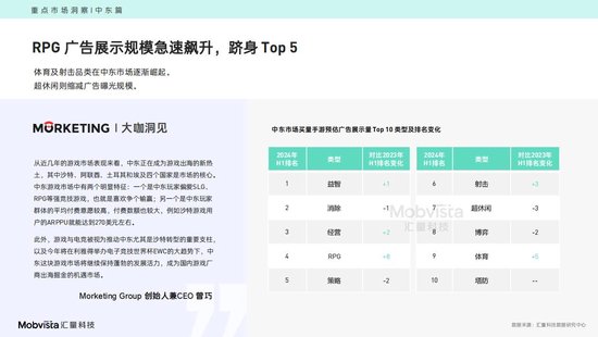 7 月 26 日,中国国际数码互动娱乐展览会 ChinaJoy 开幕,在 W4 馆 B305 展区,开发者全球增长平台汇量科技 Mobvista 为开发者呈现了《 2024H1 海外手游市场白皮书——全球获客及变现指南》。白皮书显示,中东市场 RPG 手游广告展示规模急速飙升,跻身 Top 5 ;体育及射击品类手游逐渐崛起。超休闲手游则缩减广告曝光规模。