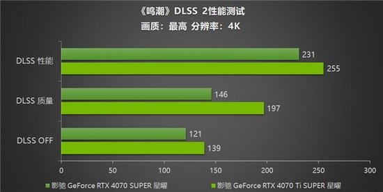 在最为主流的2K分辨率下,影驰 GeForce RTX 4070 SUPER 星曜和影驰 GeForce RTX 4070 Ti SUPER 星曜在《鸣潮》游戏实测中表现也是毫不逊色。两张显卡在关闭DLSS的情况下帧数分别达到了239帧和250帧的优异成绩。开启DLSS 2后,在DLSS 质量模式下两张显卡的成绩均拥有明显的上升,在DLSS性能模式下,帧数更是均上涨了135%以上的优异表现,分别达到了333帧和342帧。NVIDIA DLSS技术的加持,让玩家能够享受在高画质下依旧高帧流畅的游戏体验。