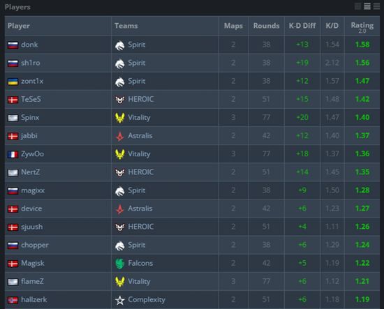 排名前三的都是Spirit战队选手,其中donk有着1.58的Rating,sh1ro为1.56,而zont1x则为1.47。整体来看,基本上都是获胜队伍中有着强力发挥的选手。