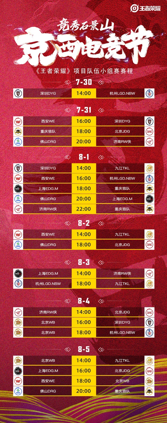 B组:佛山DRG、上海EDG.M、济南RW侠、重庆狼队、北京JDG
