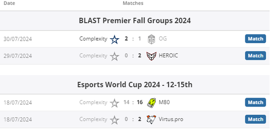 相对于上半年优秀的表现,Complexity休赛期归来的表现并不好。上半年,Complexity在EPL S19取得3-4名,并在ECL延雪平站中击败Falcons夺冠,然而从休赛期归来的他们几场比赛他们的表现不尽如人意。EWC中,他们先是0-2输给了Virtus.pro然后又输掉了和M80的北美内战早早出局,BLAST秋季小组赛的首场比赛,他们也没能击败由教练替补上场的HEROIC。