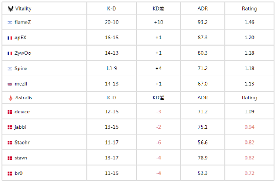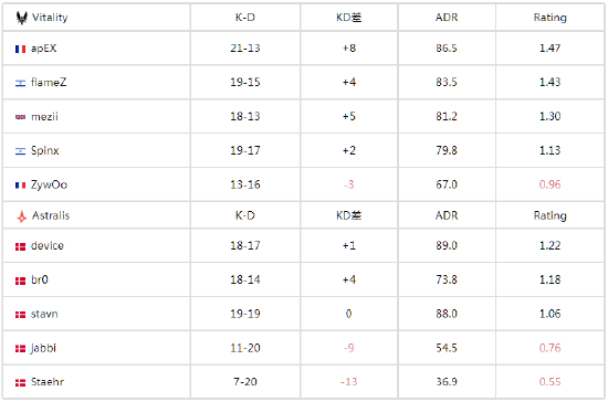下半场Vitality来到进攻方,手枪局同样进攻A区,但是状态在线的device没给他们机会直接三杀挡住进攻,赢下胜利的Astralis顺势扳回两分。但是进入长枪局的flameZ再次发挥帮助Vitality扳回节奏,随后Vitality一路拿到赛点顺势终结图一。