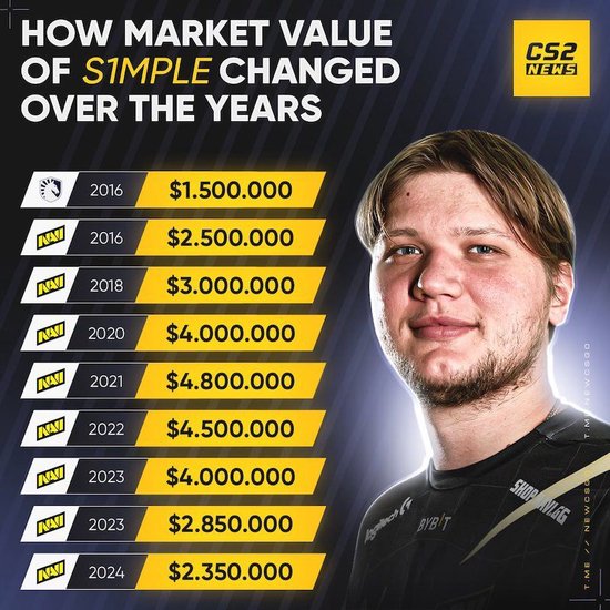 日前社区分析了不同时间段s1mple的个人身价,从2016年在Liquid效力起一直到现在赋闲在家。
