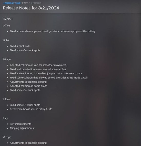 今天CS开发人员推送了约3GB的更新,主要是针对Office、Nuke、Mirage、Inferno、Italy、Vertigo、Ancient、Anubis以及Overpass地图上的部分细节进行了优化。